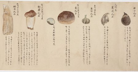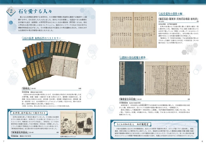 薬となる自然物を研究する本草学が、その実態や特徴を実証的に調査する物産学へと展開する中で、石に注目した人々がいました。幼少より石を収集し、生涯並々ならぬ愛情を注ぎ続けた近江(滋賀県)の木内石亭をはじめとした石の愛好家(弄石家)たちは、奇石と呼ばれる色や形の珍しい石をコレクションし、独自のネットワークのなかで石に対する博物学的知見を広げました。その対象は化石や石器などの考古遺物も含まれ、日本における自然科学や考古学研究の原点となりました。