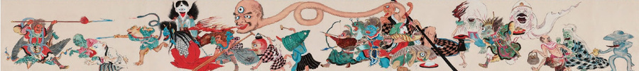 約9.5mにわたって、様々な姿をした妖怪たちを描いた絵巻物。行列の先では神様たちが妖怪を迎え撃つ様子が描かれます。