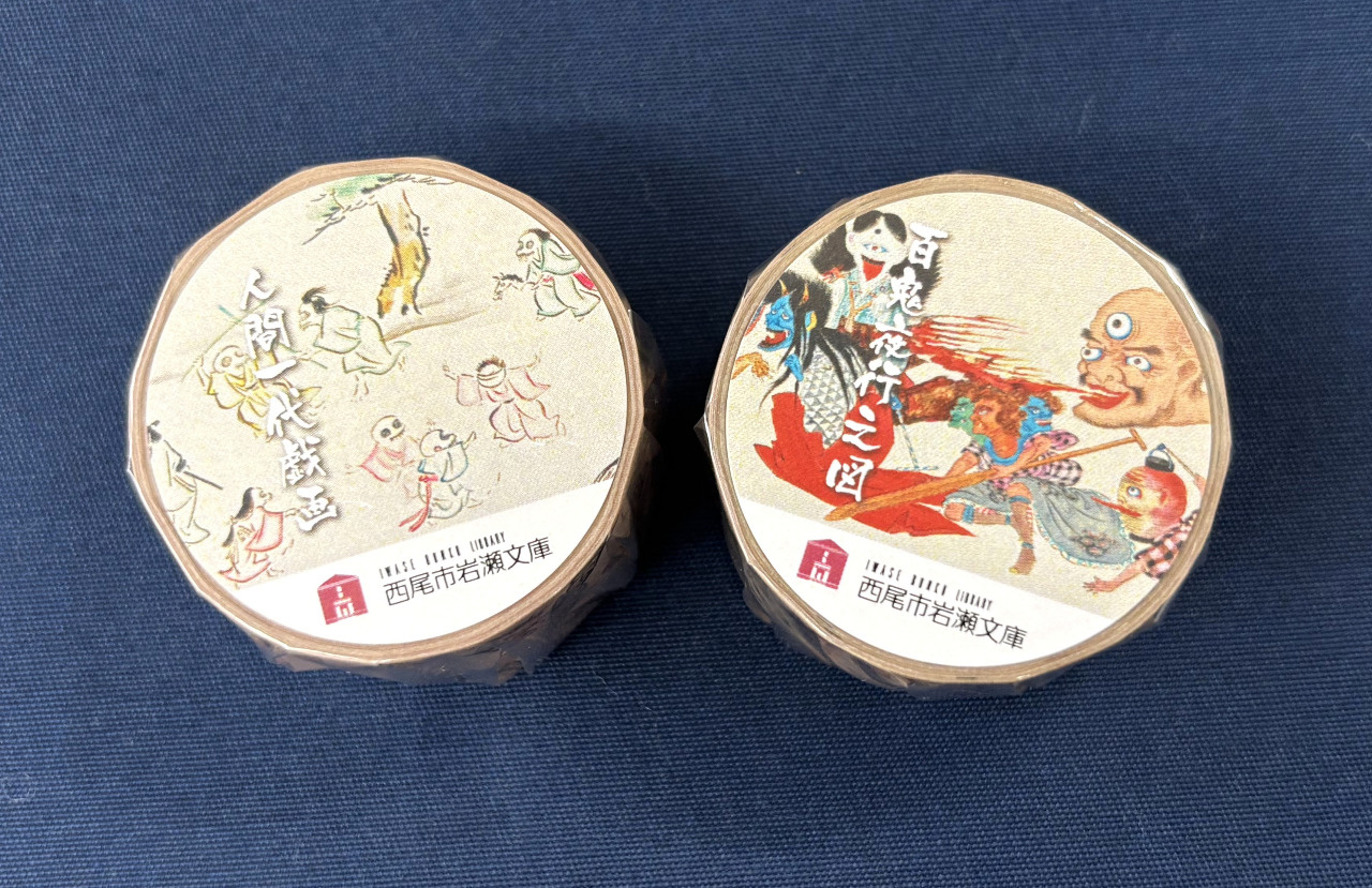 色鮮やかな妖怪やかわいらしい骸骨の絵など、岩瀬文庫の蔵書のなかから選りすぐりの絵巻物をあしらいました。手紙の封をしていただくのはもちろん、手帳やカレンダーの飾り、お手元の文房具などのアレンジ、プレゼントのラッピングなど様々な場面でお使いいただけるマスキングテープです。ぜひお手にとってご活用ください!